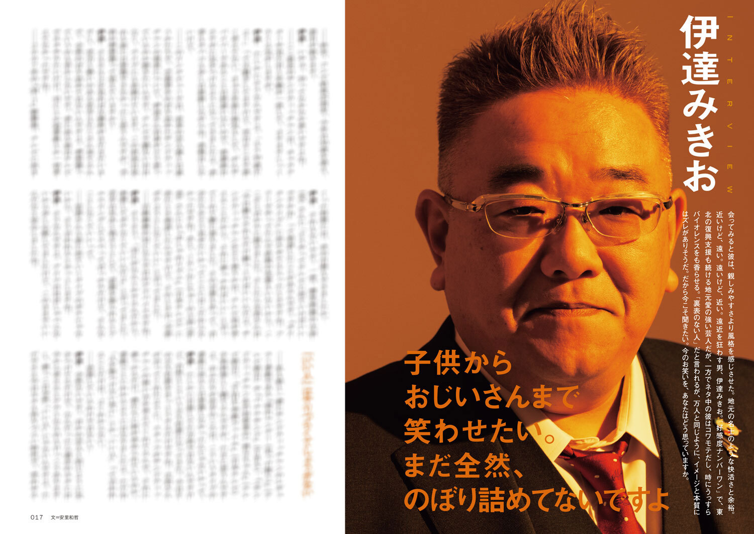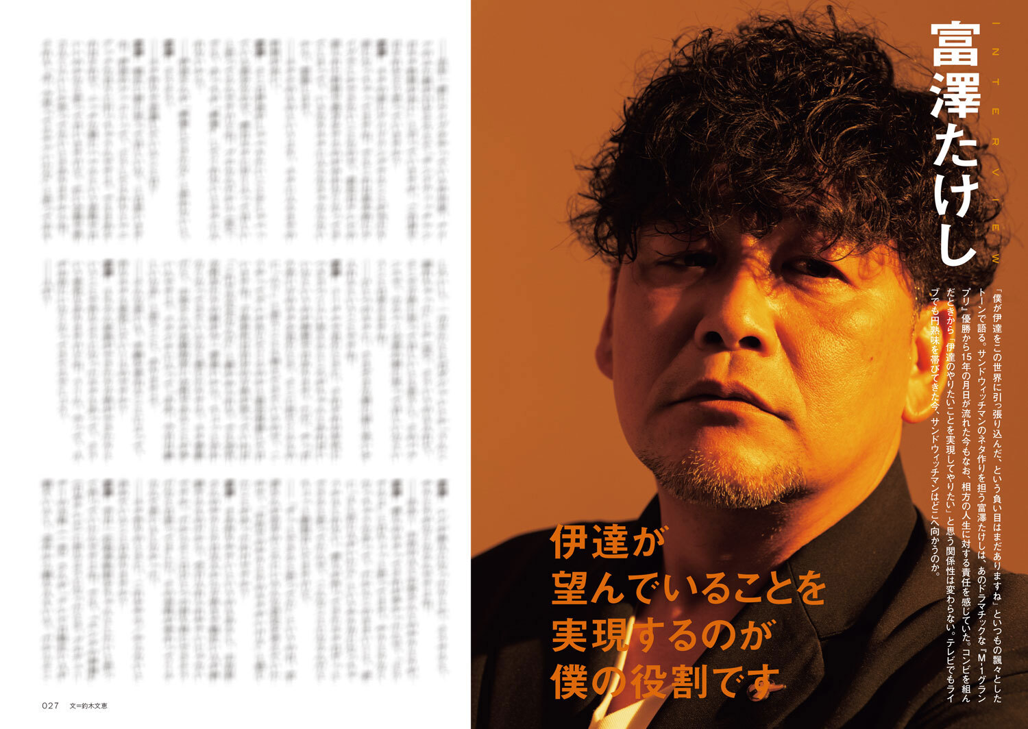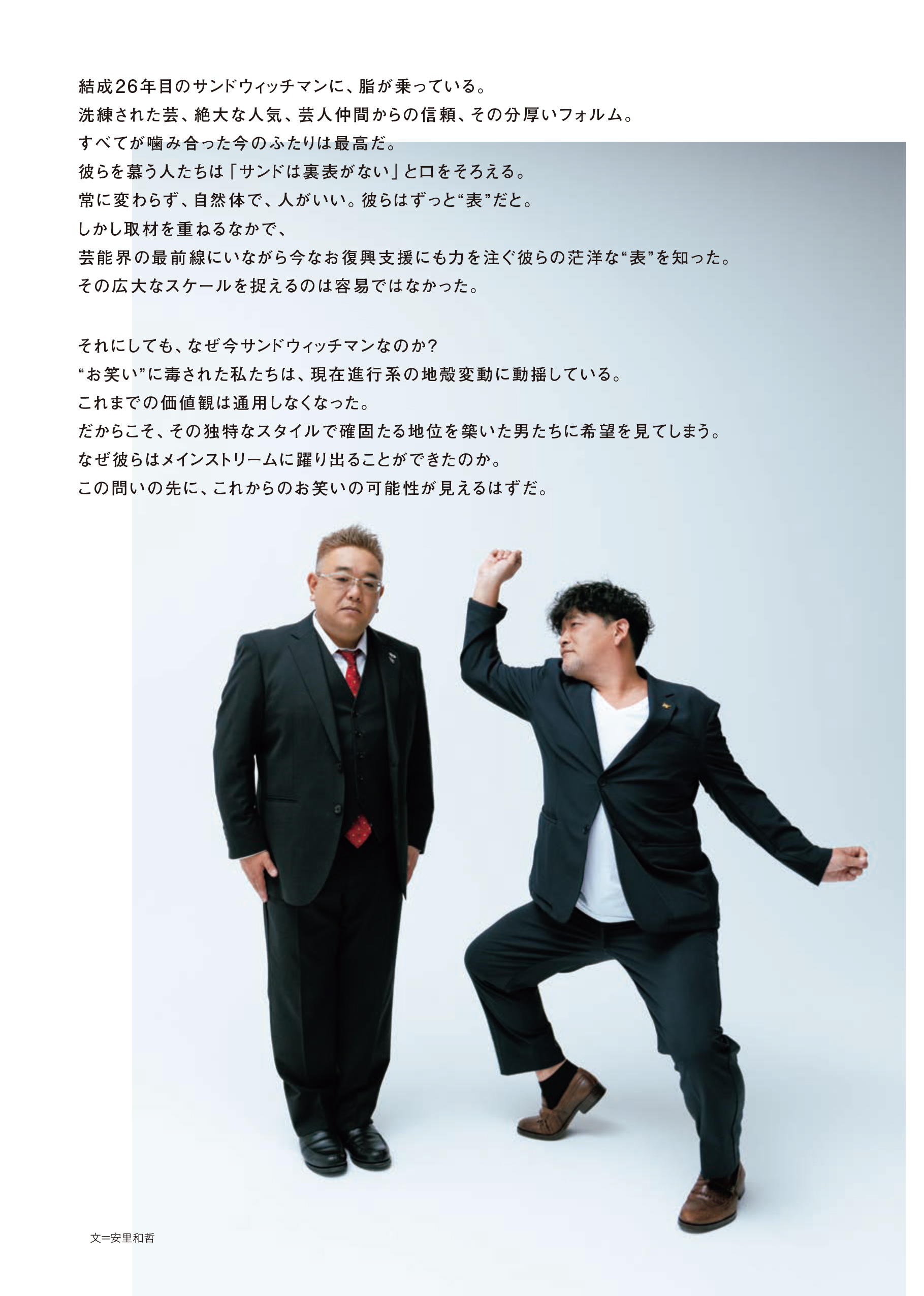 表紙と撮り下ろしグラビアは気鋭のフォトグラファー・嶌村吉祥丸が撮影。これまでにない伊達みきお・富澤たけしの素顔と関係性を記録した。