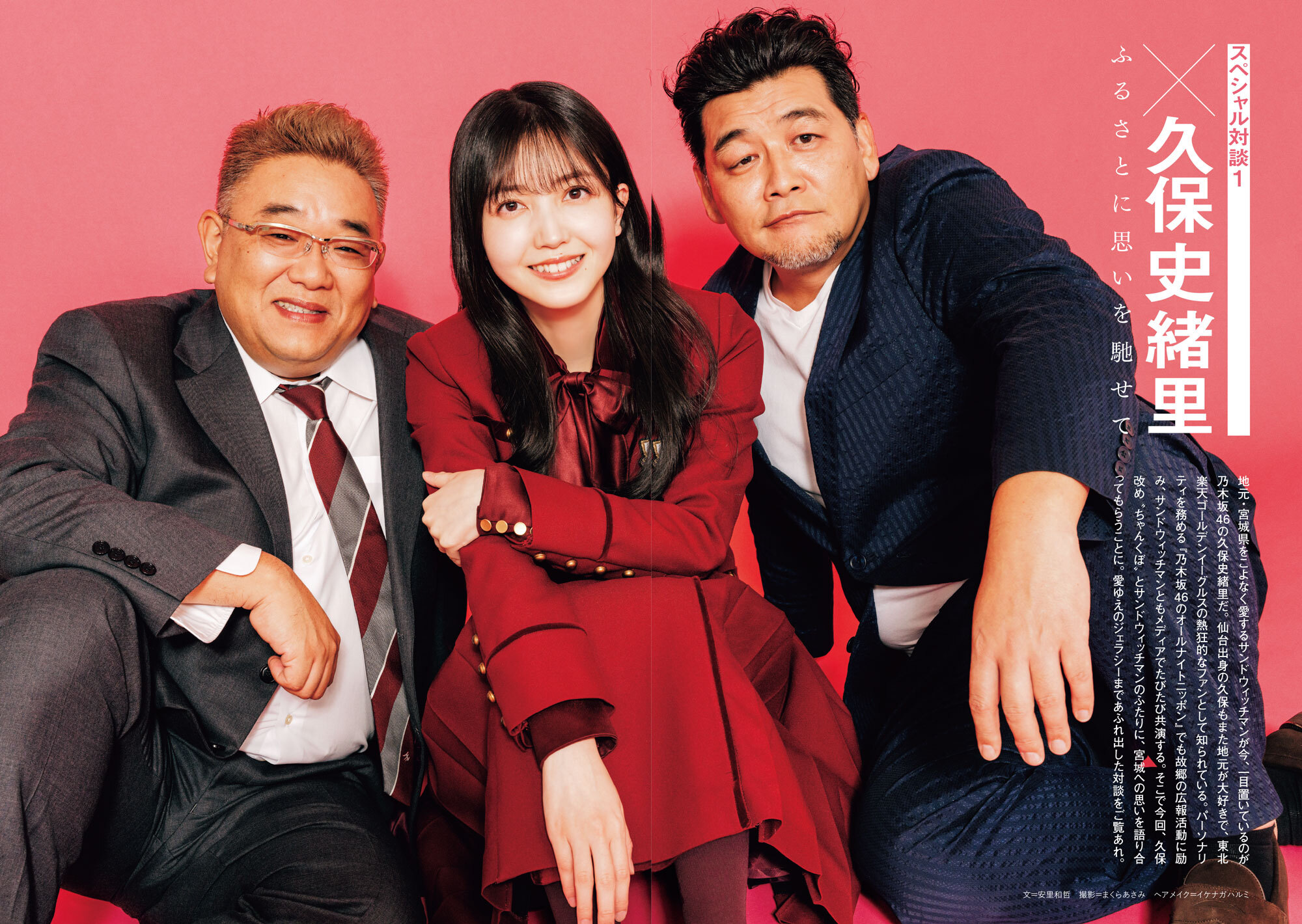 さらに、サンドウィッチマン&久保史緒里(乃木坂46)による座談会も収録。久保にとってサンドウィッチマンは子供のころからあこがれの存在であり、インタビューでも「乃木坂46に入ってから伊達さんと富澤さんにお会いするまで、5年もかかったんです」「ほかのメンバーがおふたりと共演していると悔しかった」と熱弁。