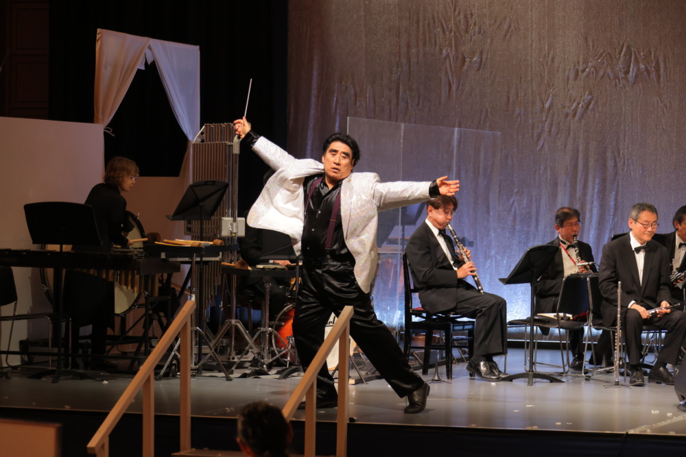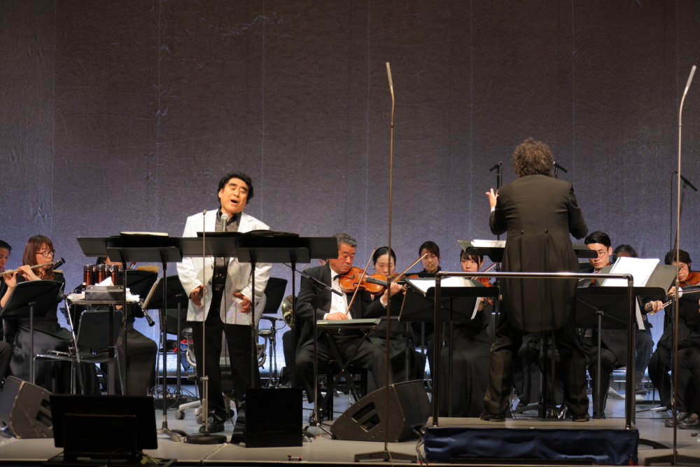 再びオーケストラが登場し、深見が楽曲説明を行うと、一度ステージを降りて「鳴門海峡」を演奏。雄大な情景が目に浮かぶような演奏が会場に広がる。拍手をしながらステージに戻った深見は、自ら指揮棒を手に取る。リハーサル時に、手がむくんで指揮棒が飛んでしまったというエピソードを披露し、「今度は大丈夫」と、右手の薬指に指揮棒をひもで結んでいることを明かすと、会場からは驚きと笑いが起こった。