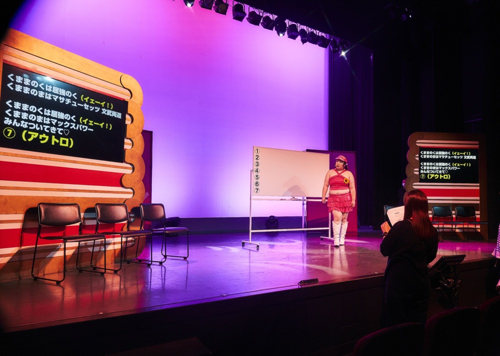 超満員のよしもと幕張イオンモール劇場を埋め尽くし、期待に胸を高鳴らせる「右腕」(くままファンの呼称)の前に、くまま親衛隊隊長であるkento fukayaが現れる。前説的に、「くままは屈強」が歌われるかどうかは本人次第であること、くままは「かわいい」などの言葉で輝ける存在であるため、声出しOKであることが説明される。