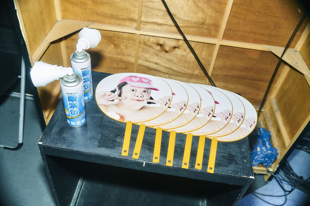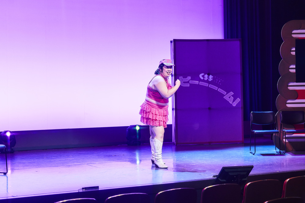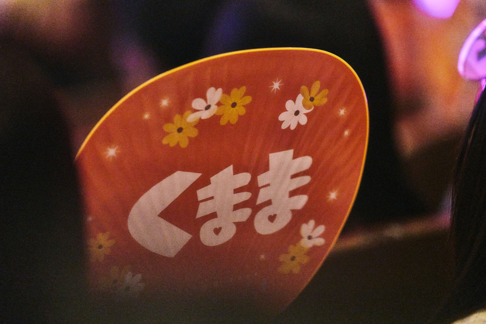 やがてカウントダウンが行われ、0のコールとともにステージに横たわり、ポーズを決めるくままが出現! すかさず「くままは屈強」を熱唱する。息遣いが荒いのは全力の証だろう。歌い終えてもなお息を切らせているくままに、舞台上はもちろん、客席のファンたちがくままうちわで風を送る。
