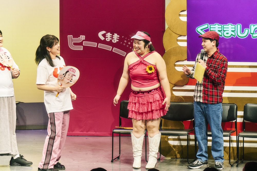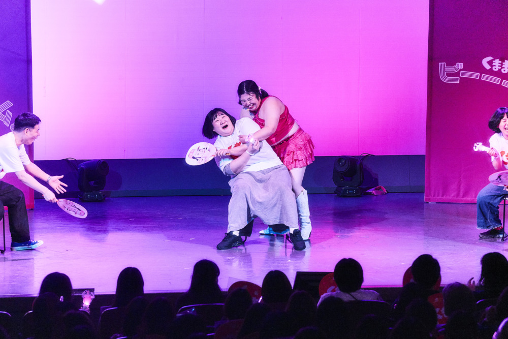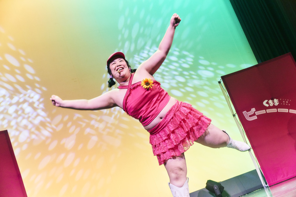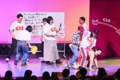 さらには、くままが「うまま」になり、みんなが馬乗りになるなど、エンタテインメント性の高いステージを披露。顔にマイクを固定するための養生テープが剥がれるほどの熱唱の末、「みんな一人ひとりが最強です!」と叫んで2度目の「くままは屈強」は締めくくられた。