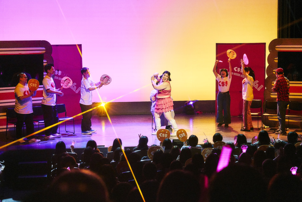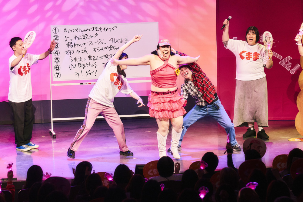 最後に、「くままと一緒に歌おう」のコーナー。「くままは屈強」を1行ずつ確認しながら、くまま自らコール&レスポンスのレクチャーを行う。さらに舞台上のファンたちがどう振る舞うかもくままが指定し、仕掛けが盛りだくさんの2度目の「くままは屈強」が歌唱されることに。「触ってダメなところはない」というくままをネルソンズがリフトしたり、kentoと稲田によるフュージョンポーズを破ってくままが飛び出してくる振りが加えられたり。
