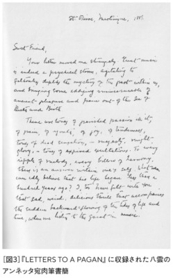 書簡集はこの地から始まり、書名ともなる八雲のアンネッタへの呼びかけでもある「異端者」はシンシナティ時代と同様に周囲から好意的には見られず、孤立する彼を弁護したことに由来する。そうやって成人し再会し擁護さえしてくれた女性に春本の話を持ち出すのはいただけない。