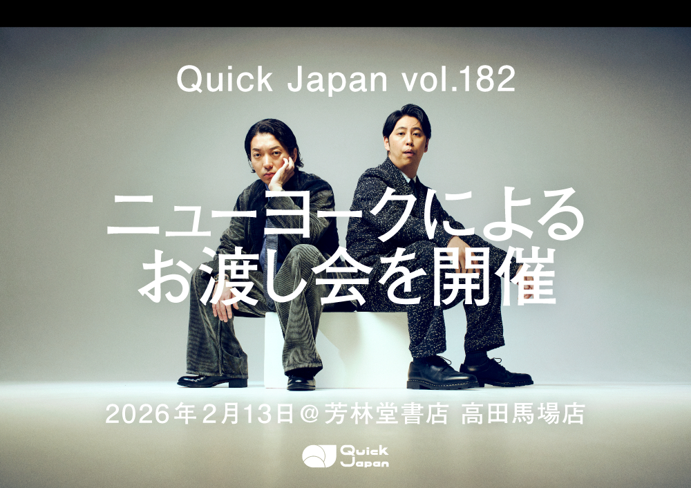 2026年2月13日(金)に発売となる『Quick Japan』vol.182の表紙&巻頭特集には、お笑いコンビ・ニューヨークが登場。その発売日に、芳林堂書店高田馬場店にてニューヨークのふたりによるお渡し会を開催する。