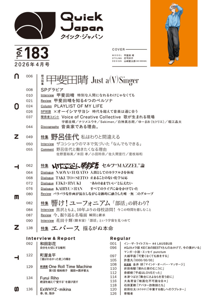 甲斐田晴のアーティストとしての信念とこだわりを紐解く表紙&40ページ特集!バックカバーは野呂佳代【Quick Japan vol.183コンテンツ紹介】