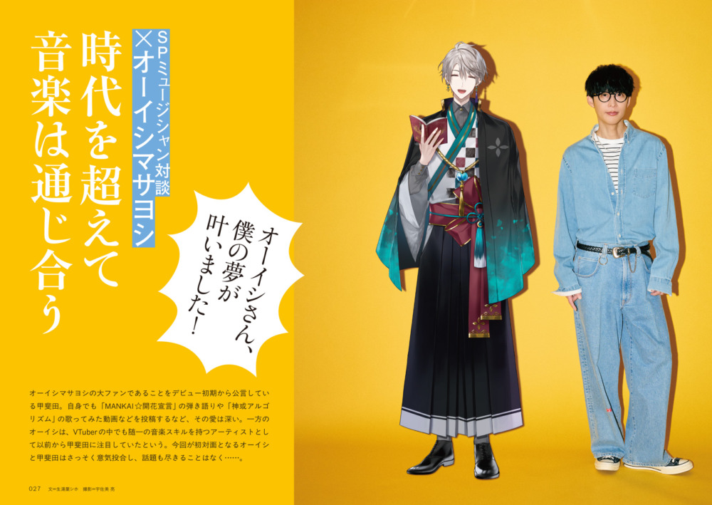 特集ではソロインタビューのほか、甲斐田が尊敬してやまないシンガーソングライター・オーイシマサヨシとの対談も実現。「夢が叶いました!」と感慨深げに語る甲斐田と、VTuberの中でも随一の音楽スキルを持つアーティストとして甲斐田の活動に注目してきたというオーイシ。ふたりの尽きることのない音楽トークは必読だ。