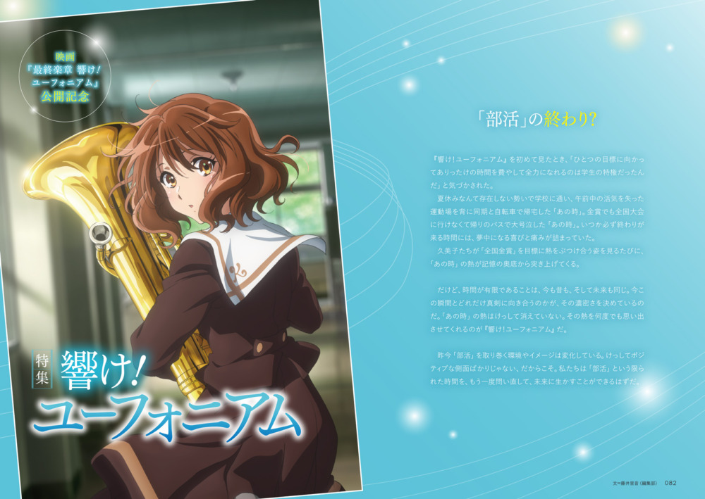 特集内では、アニメ名場面の振り返りや、黄前久美子を演じた声優の黒沢ともよ、第一期から脚本を手がける花田十輝へのインタビューが掲載される。黒沢のインタビューでは、実に10年ぶりとなった母校訪問の瞬間に立ち会い、本作と共に成長を重ねた彼女の想いに迫った。