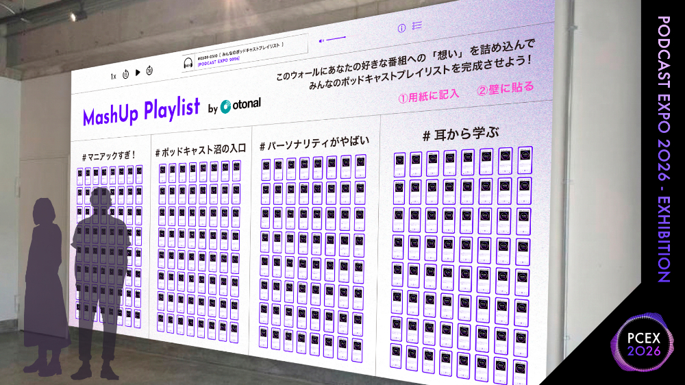 あなたの「お気に入りポッドキャスト」への想いを詰め込んで、みんなでシェアしよう。『MashUp Playlist -みんなの「推し番組」が交差する壁-』は、みんなの“推しポッドキャスト”を集めて、2日限りの巨大なプレイリストを壁に創り上げる参加型企画です。